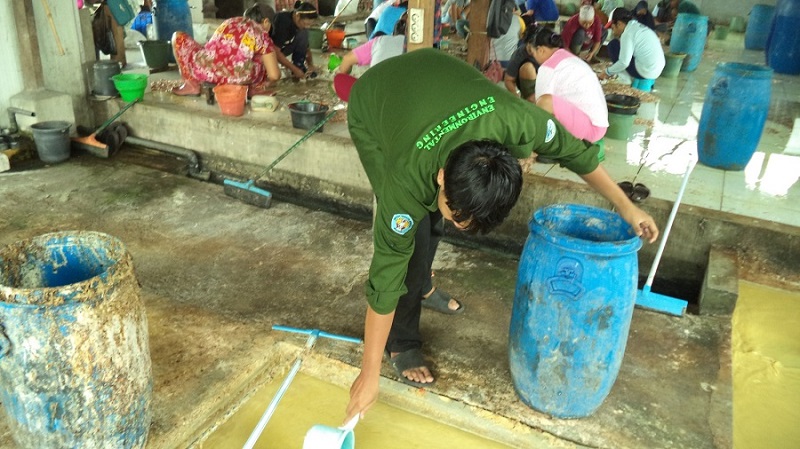 Deslyano Miyola Pratama mahasiswa ITN Malang saat melakukan penelitian di UD Ratna, pabrik keripik usus Mojokerto. (Foto: Istimewa)