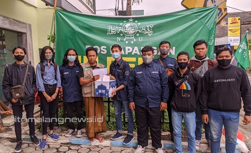 Achmad Novandi Firmansyah (lima dari kanan) bersama Himpunan Mahasiswa Teknik Listrik D-3 ITN Malang menyerahkan bantuan ke Posko Lapangan NU di Desa Sidomulyo, Kota Batu, Minggu (14/11/2021). (Foto: Istimewa)