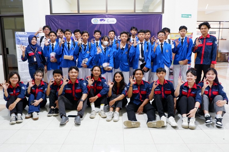 Anggota Metaspace Teknik Informatika S-1 ITN Malang foto bersama dengan para siswa SMK Negeri 2 Singosari Malang usai acara trial class. (Foto: Mita/Humas ITN Malang)